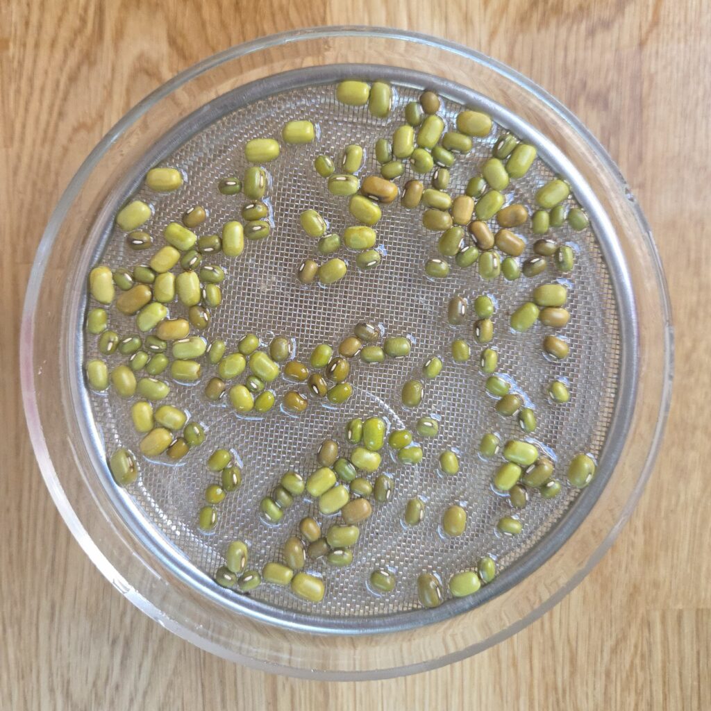 De bonen haalde ik van een biologisch merk, zoals ik dat eigenlijk meestal doe. Ze zijn tegenwoordig in de meeste tuincentra wel gewoon te koop. Daarna was het een kwestie van bonen erop leggen, het schaaltje vullen met water totdat het water nét de bonen raakt en wachten. Volgens het zadenpakje zou het zo’n 3-5 dagen duren voordat je kiemen groot genoeg zijn om te oogsten.